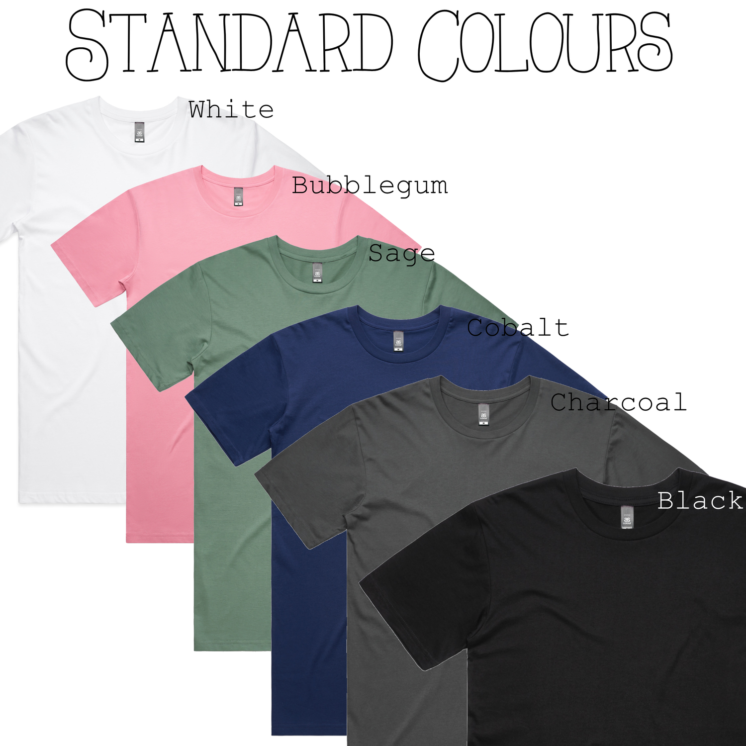 Printed on AS Colour Staple 5001 T-shirt, there's a million (71 actually) colours to choose from, so if there's a colour on the AS Website you want ( https://www.ascolour.com.au/mens-staple-tee-5001/ ), and I don't have it listed here, just pop it in the notes.